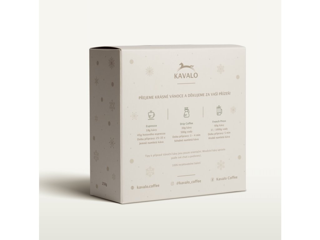 Společně s pražírnou jsme pro Vás připravili a namíchali voňavou směs ze dvou skvělých výběrových káv, které se ideálně doplňují a vytvářejí kávu s atmosférou Vánoc. Vůně vanilky, mandlí, chuť mléčné čokolády a sladkost a dochuť višňové marmelády, to jsou ty pravé provoněné Vánoce! Tento rok ji můžete mít i ve speciální Kavalo krabičce. Kavalo Vánoční káva je tak krásný dárek a poděkování.